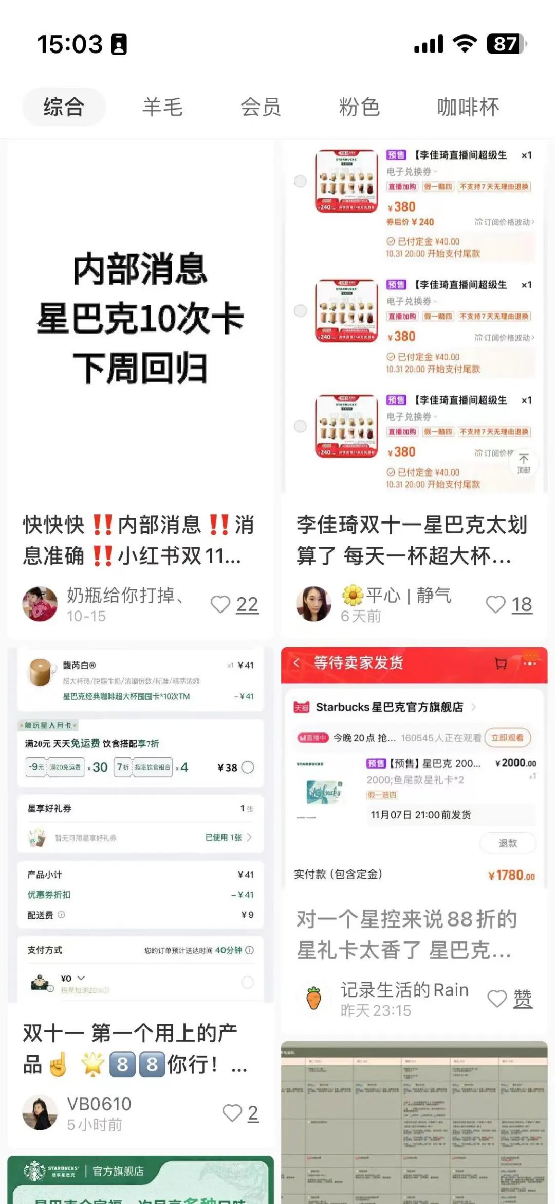 点开小红书,可以看到满屏的“撸羊毛”攻略。而星巴克官微也在 10 月中旬就“自爆”了双十一预售、囤货节奏。作为餐饮界老大哥,星巴克的这次活动从产品推新到平台促销都有涉及。
