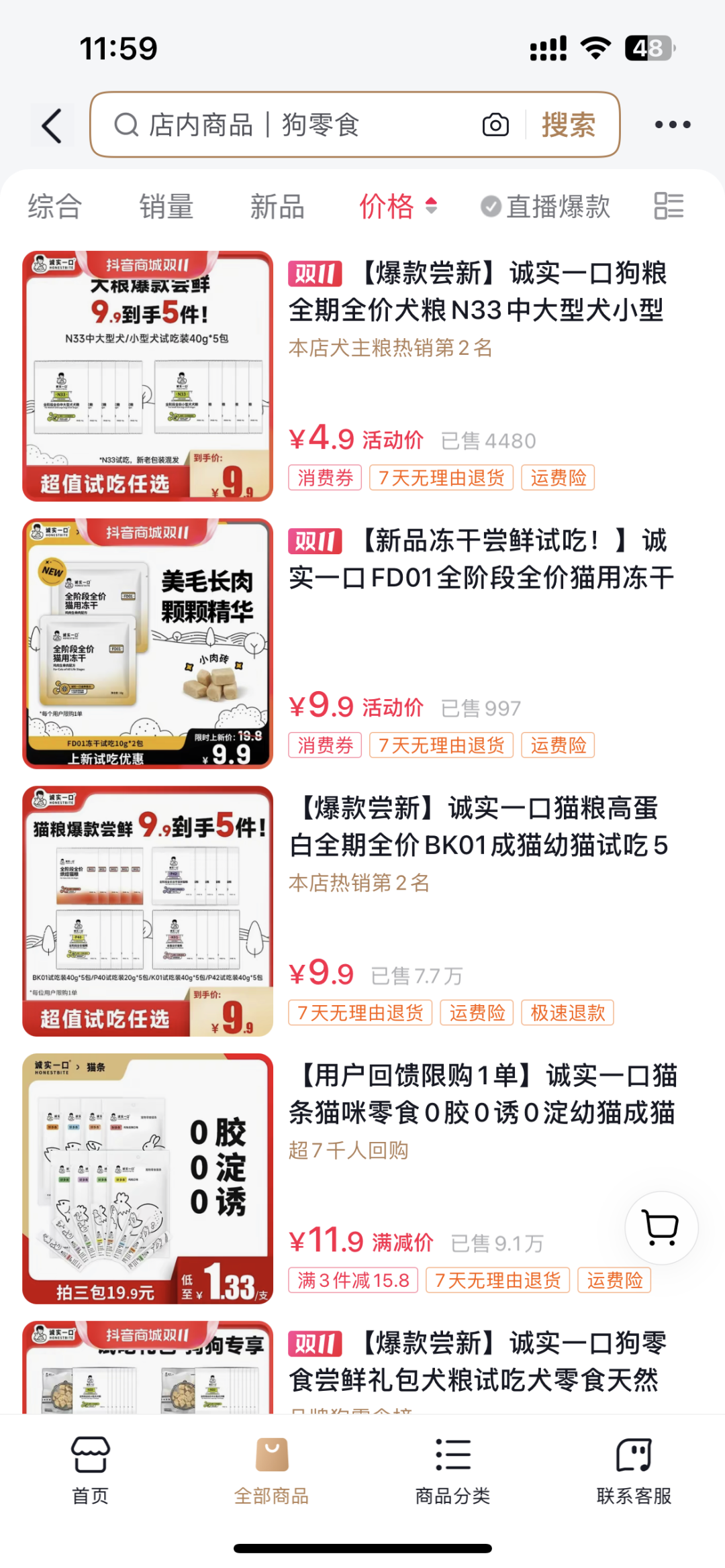 但双十一也无疑带来了更强、更多的消费意愿,如果这时还仅仅招待老顾客,也不免有些浪费。我们观察到,抖音双十一首日预售榜单中母婴用品和宠物用品的 TOP1,「贝德美」和「诚实一口」,就都在拉新方面下了功夫。
