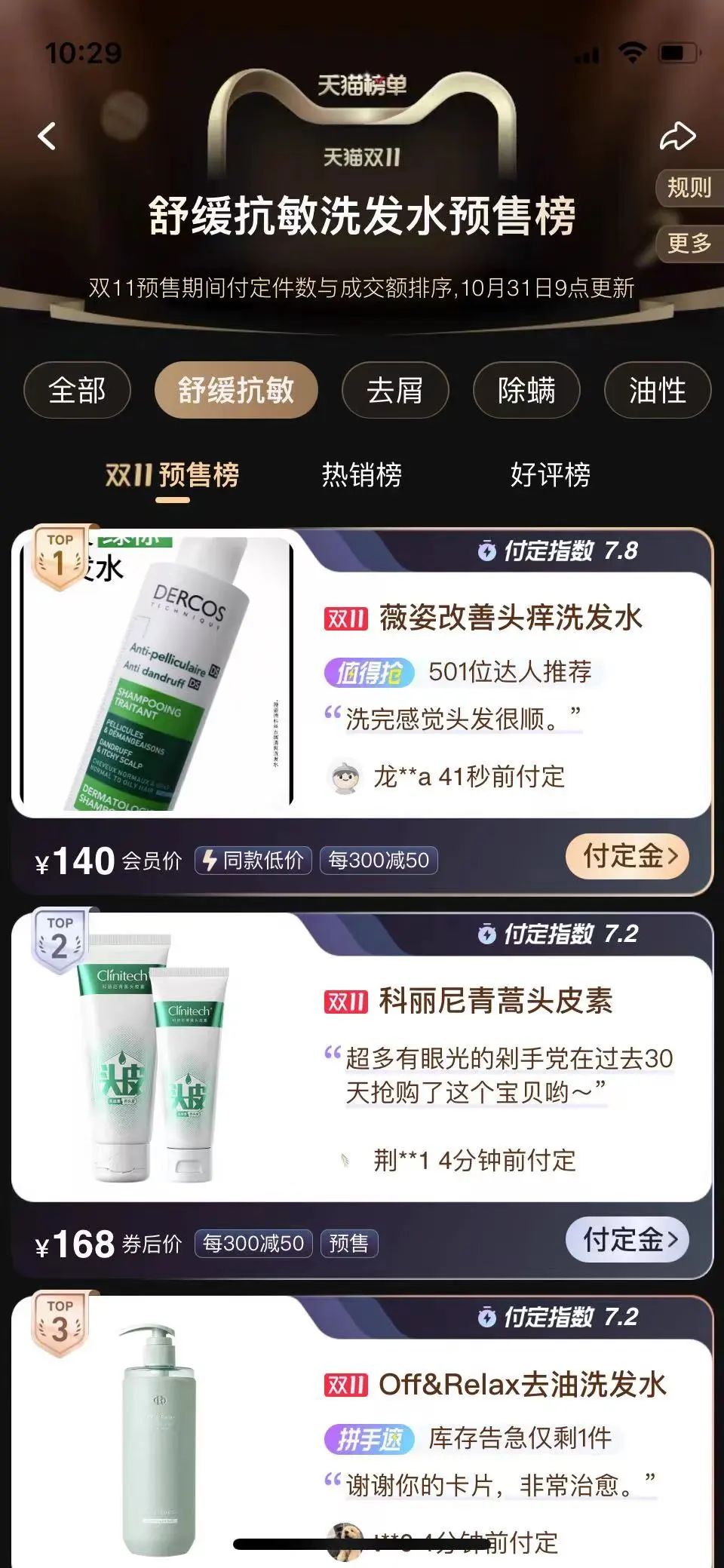 在诸多尝试中,比较成熟及值得关注的是「薇姿DERCOS」在官宣代言人后的配套全域打法。10 月 18 日,薇姿官宣李现为薇姿DERCOS 品牌代言人,推出薇姿DERCOS 去屑清爽礼盒,推广其明星单品绿标洗发水。截止 10 月 31 日,绿标洗发水登顶舒缓抗敏赛道,取得预售第一的成绩。