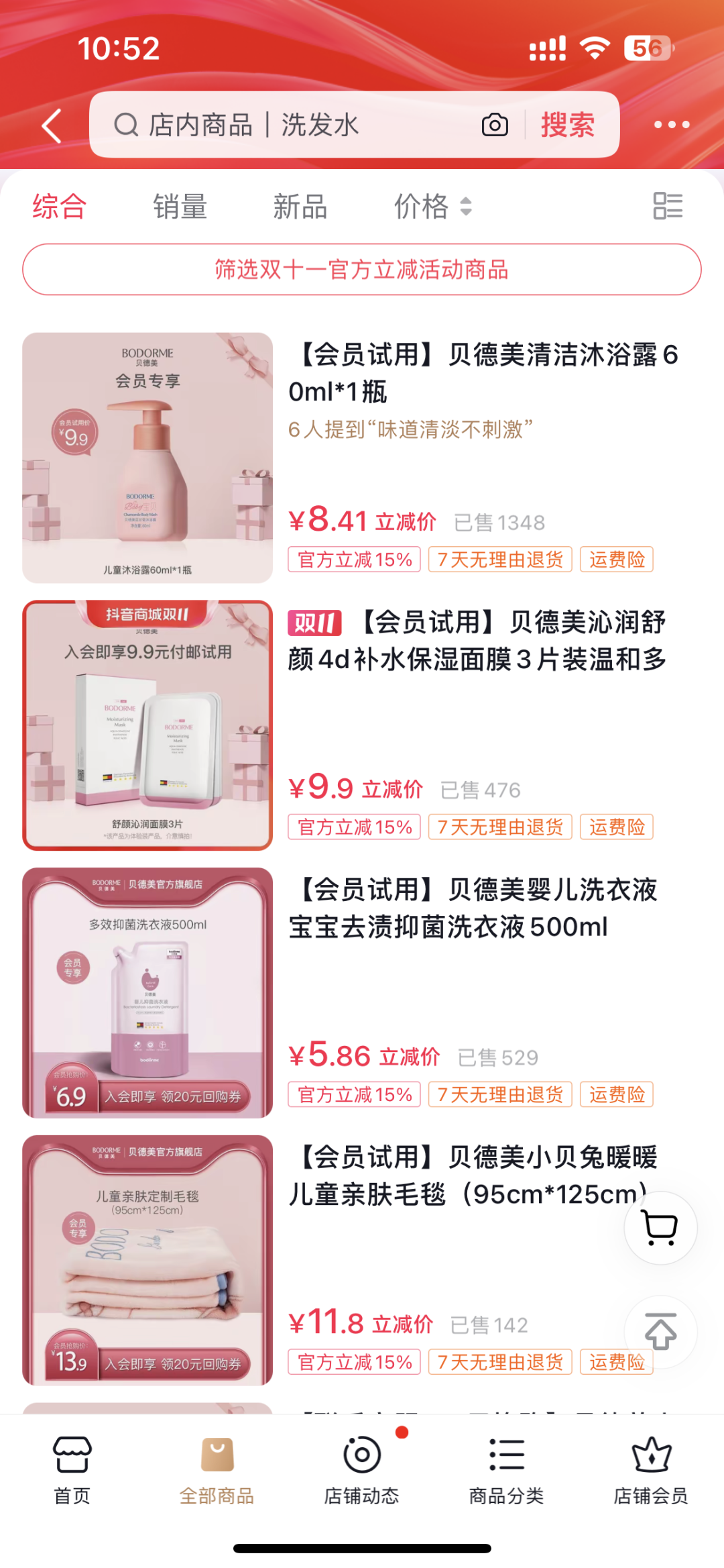 儿童护理品牌「贝德美」重在会员拉新。从沐浴露、面膜、洗衣液到毛毯,都设置了低价的会员试用,入会即享,有的还可以领 20 元回购券。会员体系对中低客单价,复购率至关重要的品类来说是日常就需要重点运营的,可以助力圈住老客,提高品牌忠诚度,双十一则是招揽更多人加入会员的好机会。