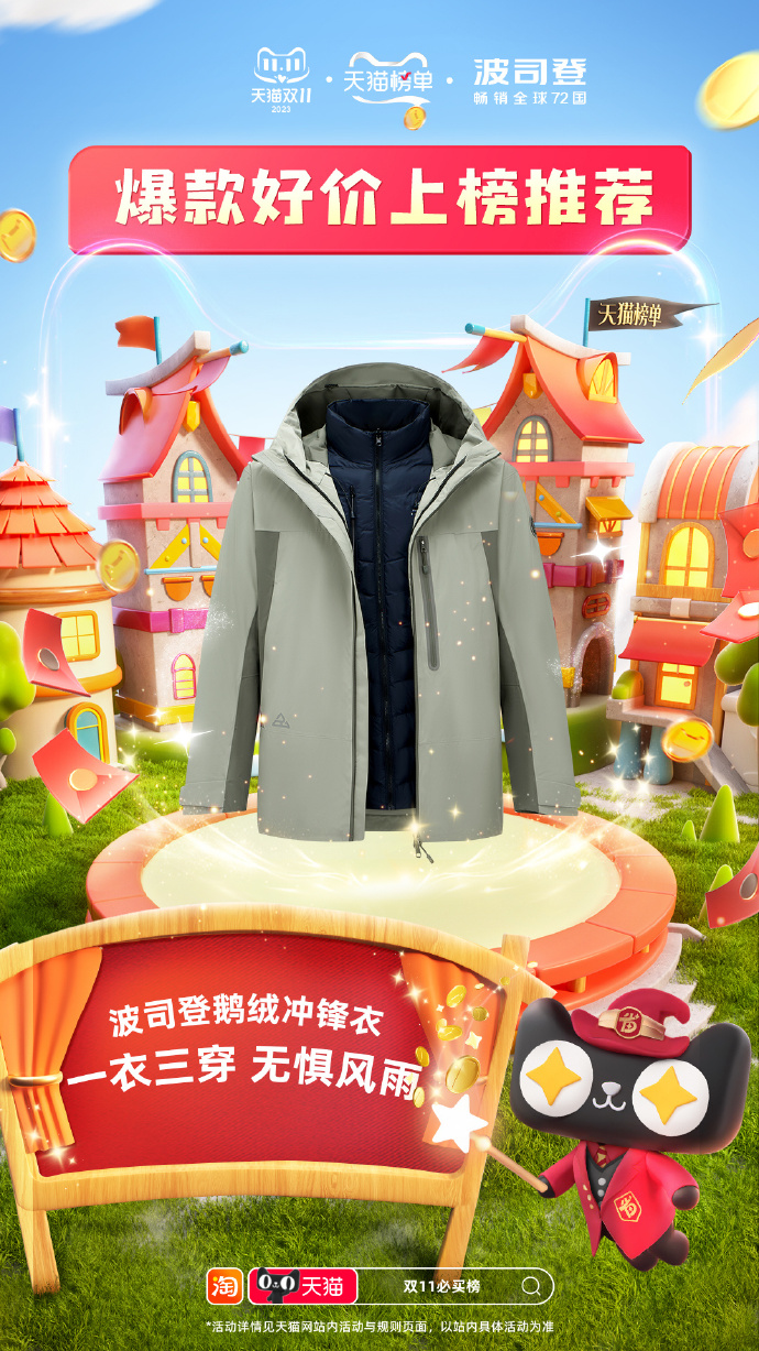 10 月 27 日,波司登官宣杨紫担任品牌代言人,同步上新的还有波司登鹅绒冲锋衣。作为今年双十一的主推新品,波司登不仅用“代言人杨紫同款”为鹅绒冲锋衣造势,在电商渠道也加大投放力度。10 月 31 日,该产品登上天猫冲锋衣V榜、热销榜、好评榜三个榜单。
