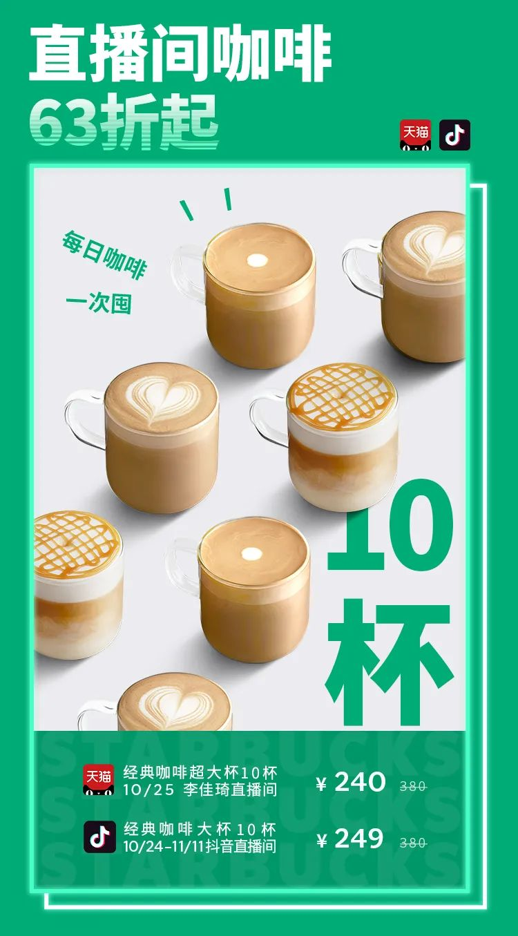 其中电商平台主打低价囤券,比如在天猫、抖音等,星巴克都上架了此前回归呼声颇高的“十次券”,10 张超大杯饮品券天猫价为 240 元,还可参加直播满减。