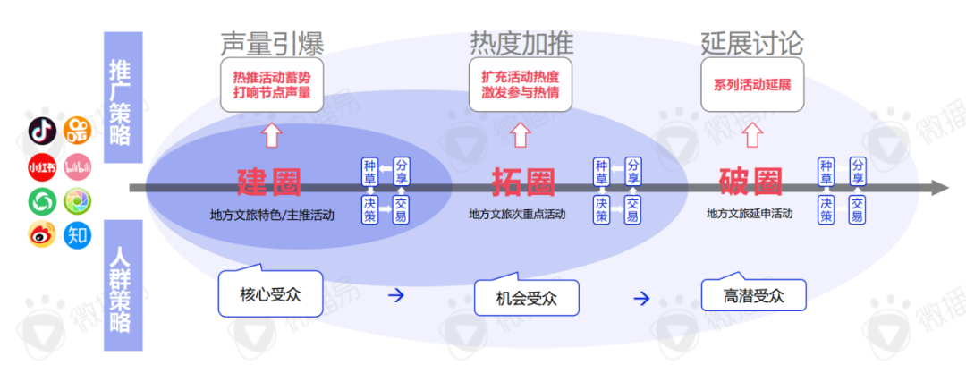 从淄博烧烤的爆火事件,我们发现文旅品牌线上营销的可行性和借鉴意义。对于这类事件型营销,我们总结出“建圈-拓圈-破圈”的圈层延展营销方法。即找到一个核心的引爆型事件作为当地文旅的主推活动,向外延申次重点文旅活动,逐层引爆,全面拉动文旅地区整体经济。
