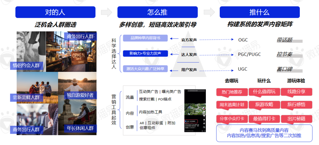 除了品牌向的曝光宣推,文旅品牌还需以达人为核心,以用户分层为导向科学匹配达人,同时构建多元化的内容矩阵,通过内容赛马找到优质内容后,再通过流量工具和信息流广告、互动广告等手段放大内容效能,有效触达用户,为用户营造起一个丰富的内容场域。