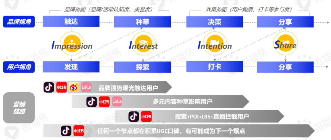而对于常态化文旅行业景点景区的社媒营销传播,从品牌触达到种草,到引导用户决策和主动分享的步骤更为常见。因此,微播易综合品牌视角与用户视角,推出文旅行业跨平台“3I+S”整合营销方法,即Impression(品牌触达激发用户发现),Interest(品牌种草激发用户兴趣探索),Intention(品牌推动决策引导用户打卡),Share(口碑分享)四个阶段,构成文旅行业种收一体化路径。