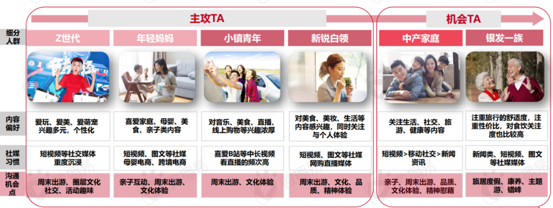 例如,抖音30岁以下、31-40岁和40岁以上都有一定的人群优势,因此,品牌在用户画像的制定上可以给人群赋予显著标签,例如Z世代、年轻妈妈、小镇青年、新锐白领,他们对旅游具有天然的热情和兴趣,品牌可围绕自身活动特点和定位,选择某一类或某几类人群作为主攻人群,展开营销攻势。