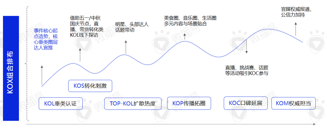 在投放策略上,建立KOX组和排布的投放节奏,沉淀优质内容。在事件核心起点选择垂类KOL影响核心受众,借助节假日等出游高峰期选择KOS达人加强探店和去处推荐内容,同时可以适当与明星或头部达人合作扩散热度,并选择在各自领域具备深度专业能力的KOP进行内容的发散与场景贴合,承接尾部和KOC的打卡分享,最后,以官媒资讯分享视角对品牌事件进行报道和公信力加持。