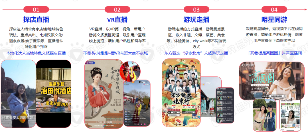 其三,文旅品牌的直播玩法相对更广,相比电商产品,文旅品牌可以走出去,以主播视角带领用户亲身体验,辅以客资收集和线索跳转。例如,探店直播,达人可以结合景点或地域特色,亲临体验。VR直播,让用户仿佛去到现成体验云旅游。游玩走播,跟随达人脚步,游玩带货一体,多汇集成短视频合集,也可以视为是新型的文旅纪录片或真人秀。明星同游,以明星为卖点,吸引用户打卡明星同游地。
