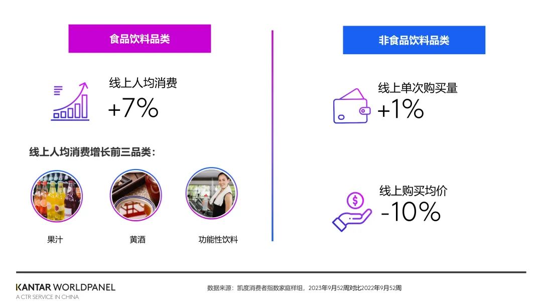● 不同品类的线上渠道所扮演的角色并不相同。对于食品饮料品类的品牌来说,线上渠道更能帮助促进消费者消费。凯度消费者指数数据显示,截至2023年9月的一年同期对比,消费者对于食品类在线上渠道的人均消费同期对比增长了7%。其中果汁、黄酒、功能性饮料在线上渠道的人均消费增长最快。