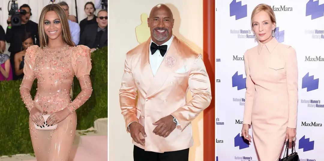 桃色在刻板印象里是女性的颜色,但它现在也被收编到男性的衣柜里,巨石强森在 2023 年奥斯卡颁奖典礼上的燕尾服夹克就是一个例子。