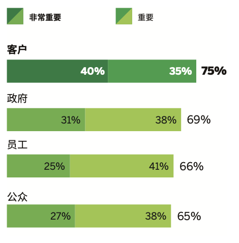客户是企业发展最终的服务对象。研究发现,40%的受访者表示,在开展ESG建设时,客户是非常重要的考虑因素,而其他利益相关方,如政府(31%)、员工(25%)及公众(27%)的排名则相对靠后。