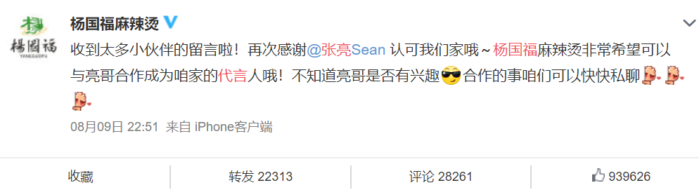 这条回复被杨国福捕捉到后,立马对张亮发出了代言的邀请。
