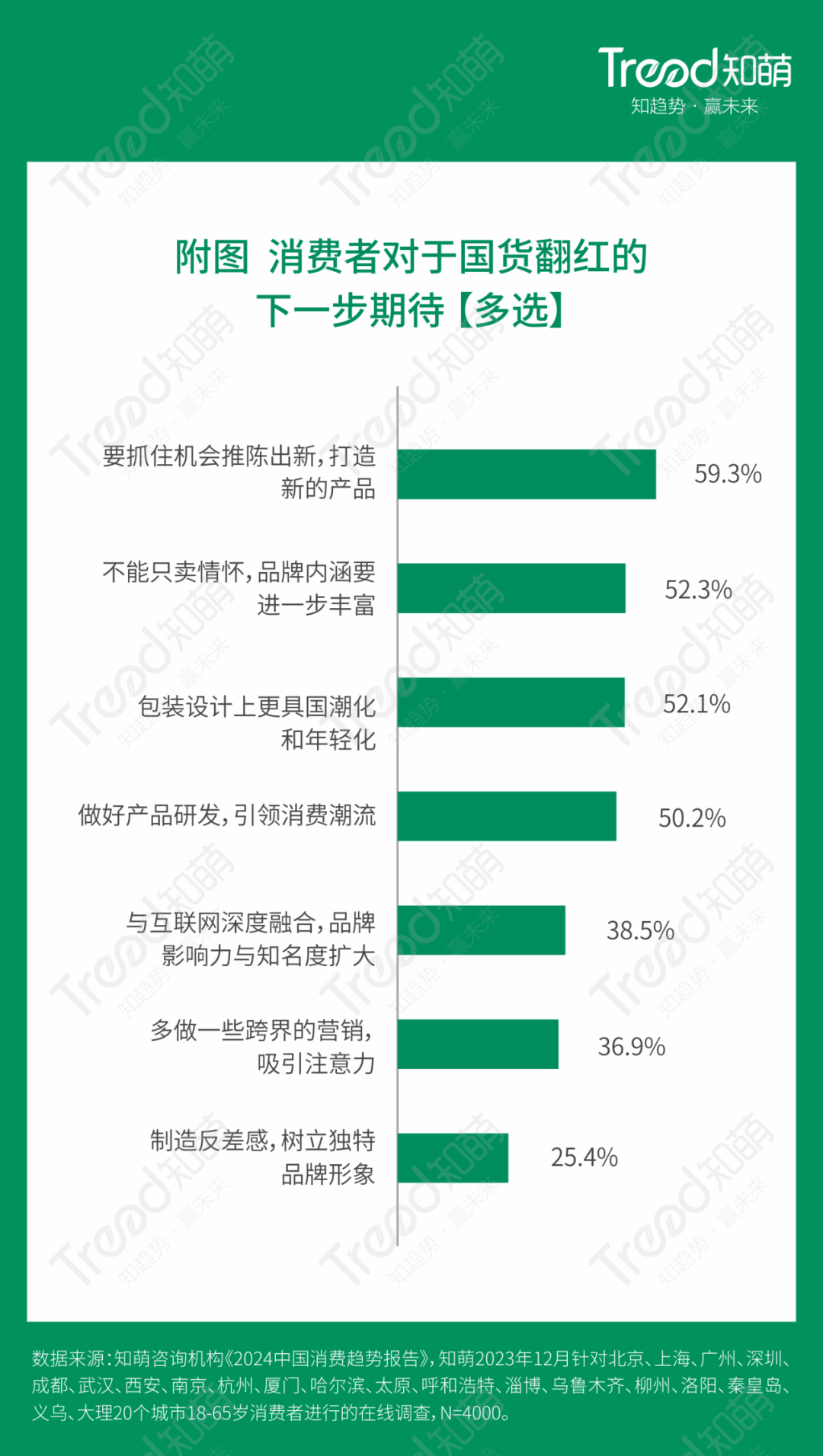 根据知萌咨询机构《2024中国消费趋势报告》研究显示,消费者对于国货下一步的期待便是创新。年轻消费群体早已跳出对老牌传统的认知圈层,取而代之的是对产品创新、品牌创新、设计创新、营销创新的期待,对国货翻红充满信心的同时,也提出了更多的期盼。