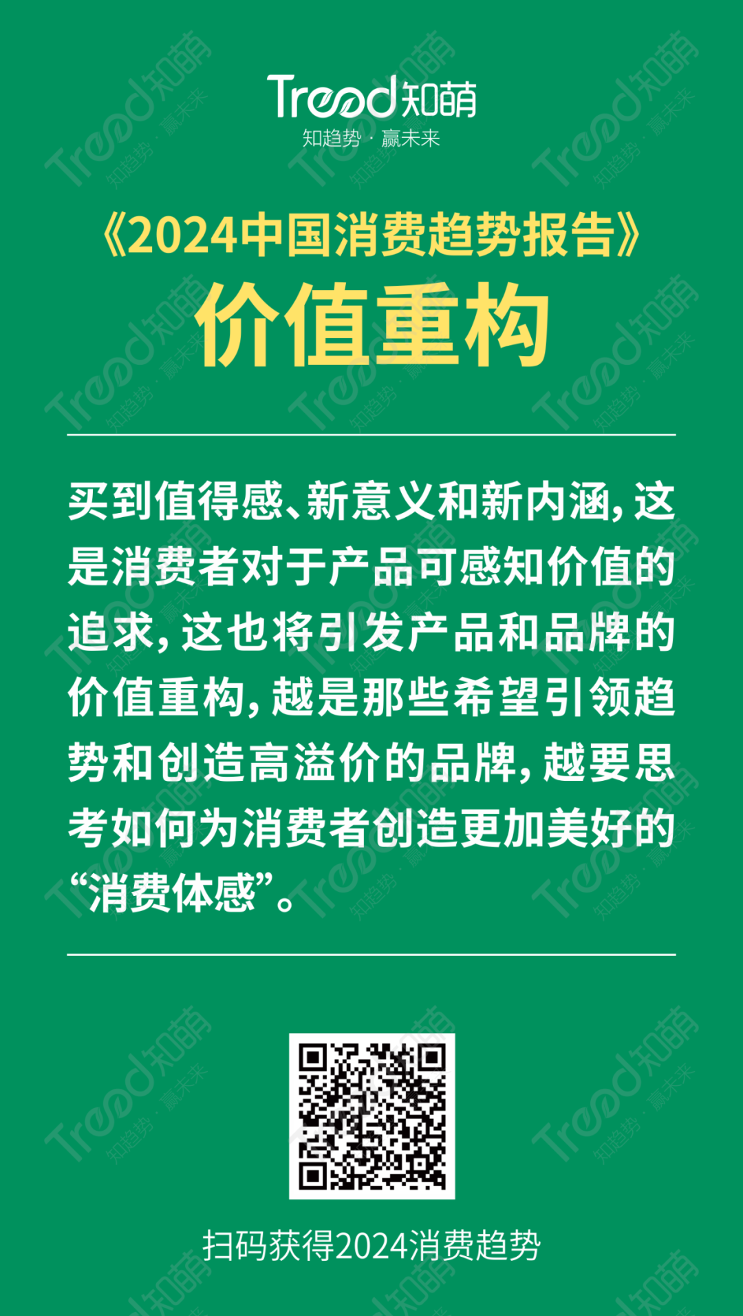 知萌针对“价值重构”的趋势预见,在《2024中国消费趋势报告》明确提出,买到值得感、新意义和新内涵,这是消费者对于产品可感知价值的追求,这也将引发产品和品牌的价值重构,越是那些希望引领趋势和创造高溢价的品牌,越要思考如何为消费者创造更加美好的“消费体感”。