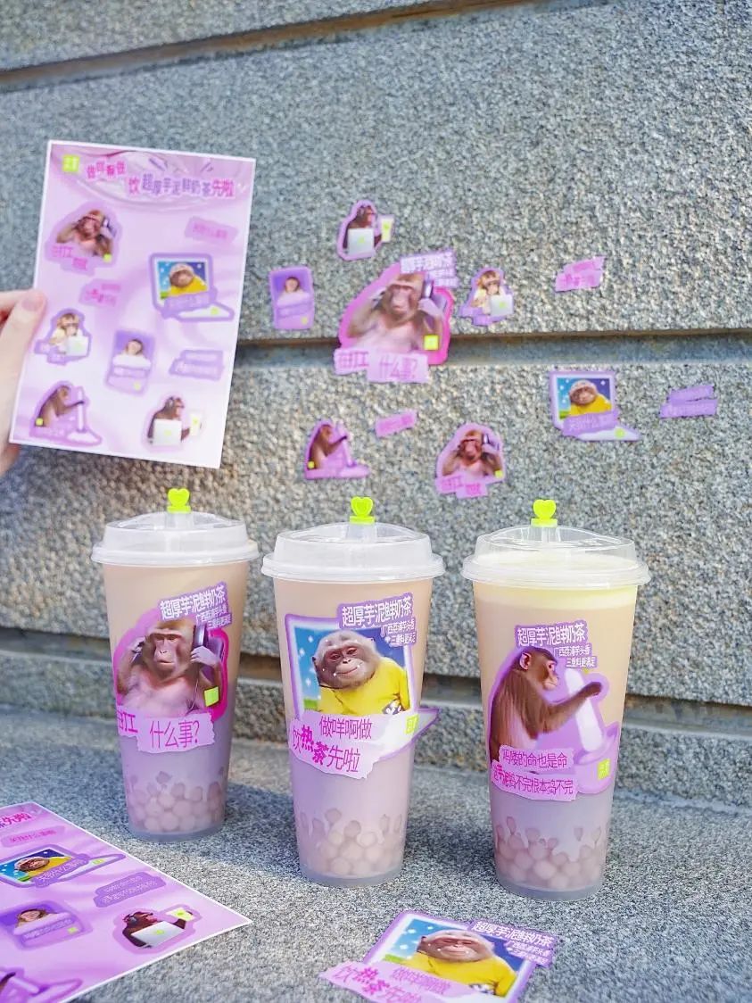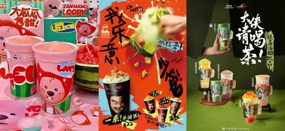 典型例如乐乐茶抓住年轻人“发疯”的精神状态,推出的发疯大汉组合包装,模仿大家常用的表情包鳌拜、李逵、张飞、蒙丹的造型,推出了“一拳”系列。这样的创意内容没有具体的联名对象,不仅有效缩减联名成本,还别具一格击中了年轻人的内心。同样,奈雪的茶与吗喽表情包的联名,百分茶推出的“楂心”系列,都是基于此。