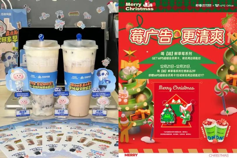 但剁椒观察发现,这样的品牌跨界出圈者甚少。以燕麦奶品牌OATLY为例,过去一年陆续有7家饮品品牌与其推出联名合作,但效果寥寥。同样,库迪与德芙、奈雪与东阿阿胶、柠季与七喜的合作,同样因为成分的常规性,缺乏大众侧记忆点。而跨界侧,茶百道与百度网盘、柠季与WPS等携手更是让人摸不着头脑。