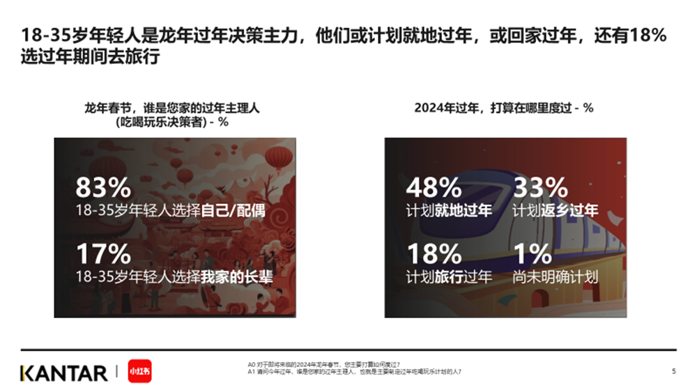 凯度与小红书商业化联合发布的《2024春节年轻人社媒趋势洞察》报告中显示, 18-35岁的年轻人正在成为春节的决策主力,其中83%的年轻人认为龙年春节家中的吃喝玩乐决策者是自己或配偶。
