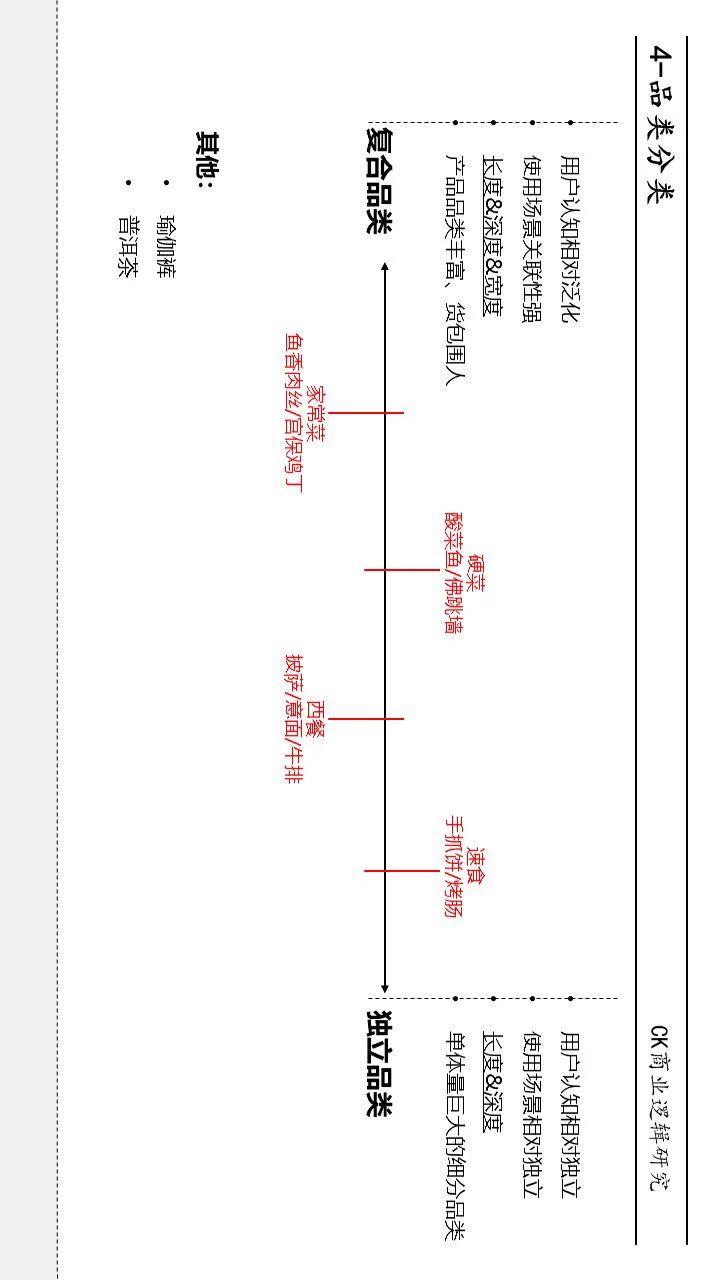 在分析上面例子的时候,我们用了二分法,把产品分为复合品类和独立品类。但是在实际的经营当中,基本上不存在100%的独立品类或者复合品类,这个与用户结构的复杂性有关系。