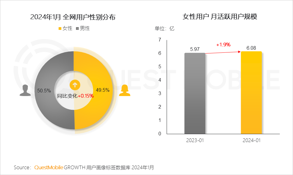 QuestMobile数据显示,过去一年来,女性群体在移动互联网中的占比持续提高至49.5%,截止到2024年1月,女性用户月活规模达6.08亿,同比增长1.9%。