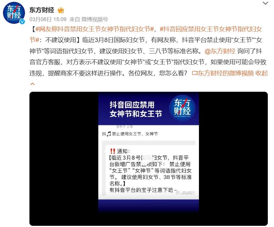 今年三八妇女节促销季,有网友发现抖音禁止使用“女神节”一称,而是改为使用38节,让妇女节回归本质。