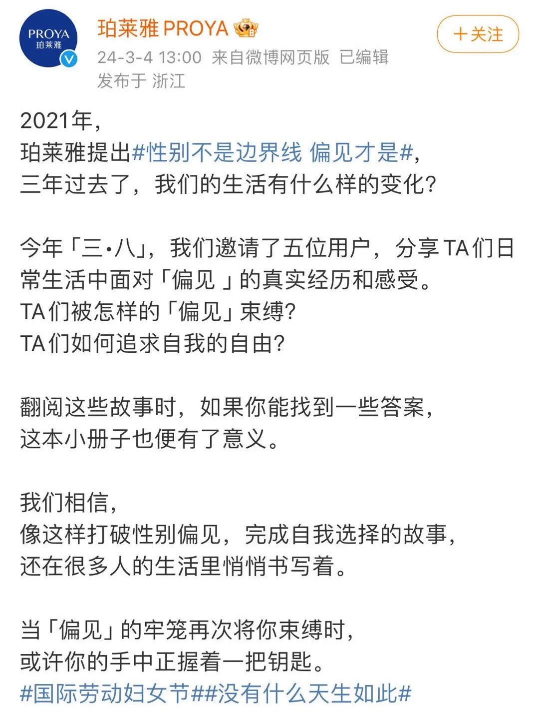 3月4日,珀莱雅以“性别不是边界线,偏见才是”为主题发布博文。品牌在三八妇女节之际邀请了真实用户发表对偏见的看法和真实感受,然而其中出现的男性表达却让网友质疑:既然是专属于女性的节日,为什么要增加男性视角?