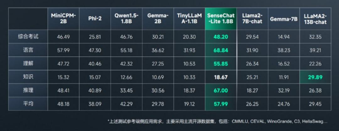 根据徐立的表述,该端侧模型在测试中超越了MiniCPM-2B、Phi-2等同量级的大模型,性能和7B、13B等尺度更高的模型相比也不逊色,即“同等尺度性能最优,跨级尺度全面领先”。