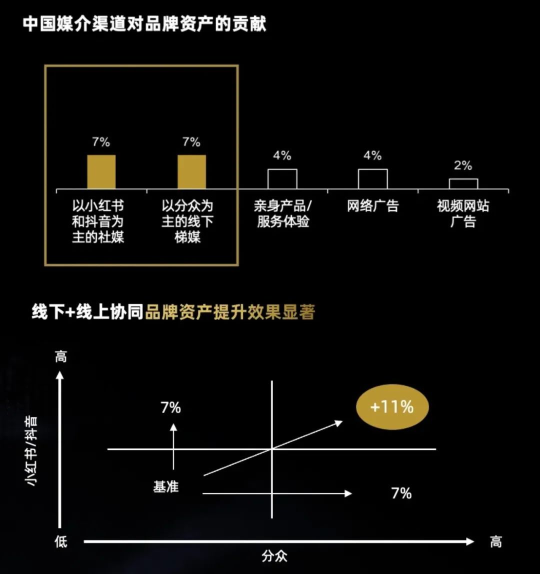 还有一个数据也很有意思,中国媒介渠道对品牌资产的贡献,排在前两位的一是以小红书抖音为主的社媒,二是以分众为主的线下梯媒;单一线上媒体对品牌资产提升作用均为 7%,线上线下组合媒介协同对品牌资产的提升能到 11%。