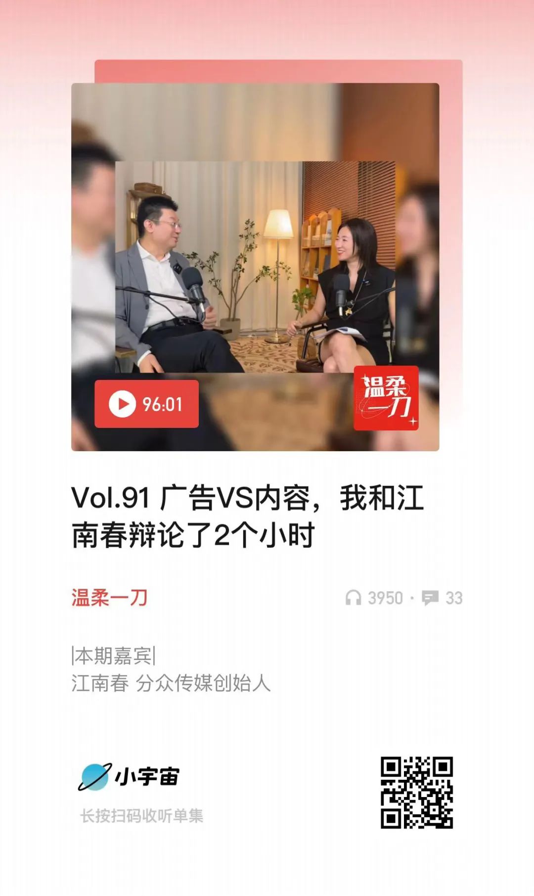 也欢迎大家在喜马拉雅、微博音频、视频号音频、 苹果播客、QQ音乐、网易云音乐、荔枝FM等平台搜索「温柔一刀」同步收听本期播客~