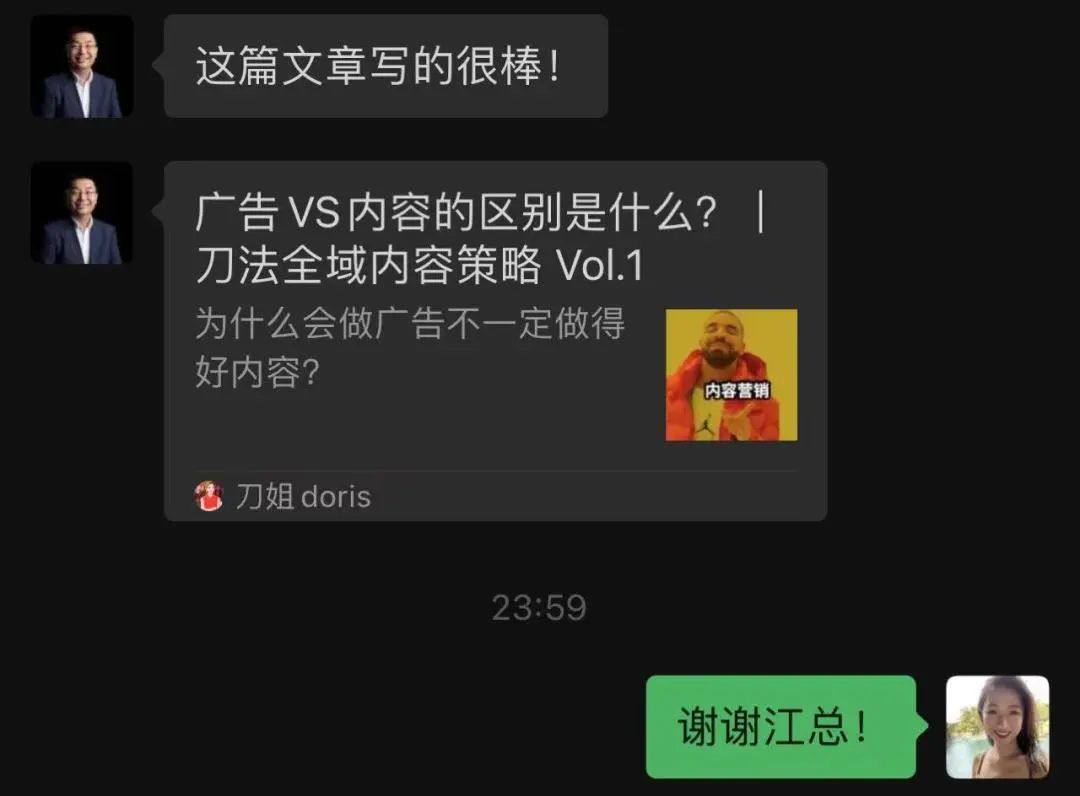 上个月我写了这篇《广告VS内容的区别是什么?》,引发了很多讨论,甚至某天晚上,我收到了江南春江总的一条微信消息,说我这篇写得很棒。