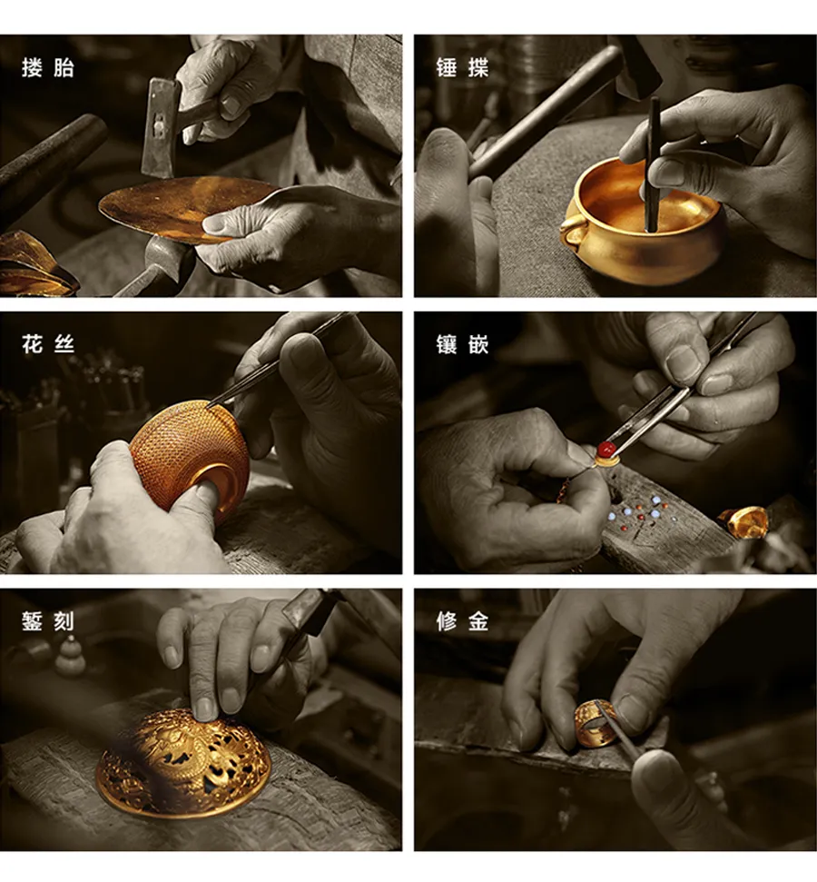 这里有必要简单介绍一下古法黄金。所谓古法,指中国宫廷古法制金工艺,其中的花丝、镶嵌技艺,2008 年被列入了国家非物质文化遗产名录。