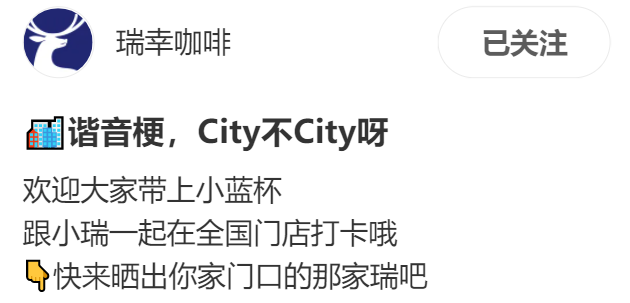 就像瑞幸这一波玩梗的城市谐音文案,虽然没有精雕细琢,但传播力和趣味性拉满。
