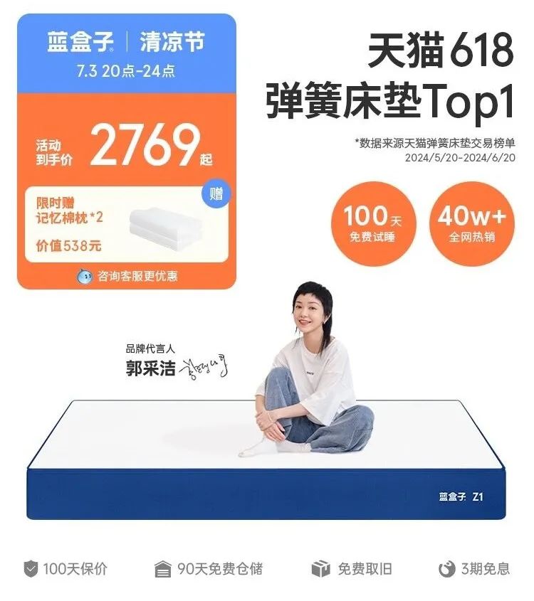 在产品上,蓝盒子一直宣称的是“做一张好床垫”,不采用“黑科技”堆料,其产品卖点更多集中在 100 天免费试睡服务。