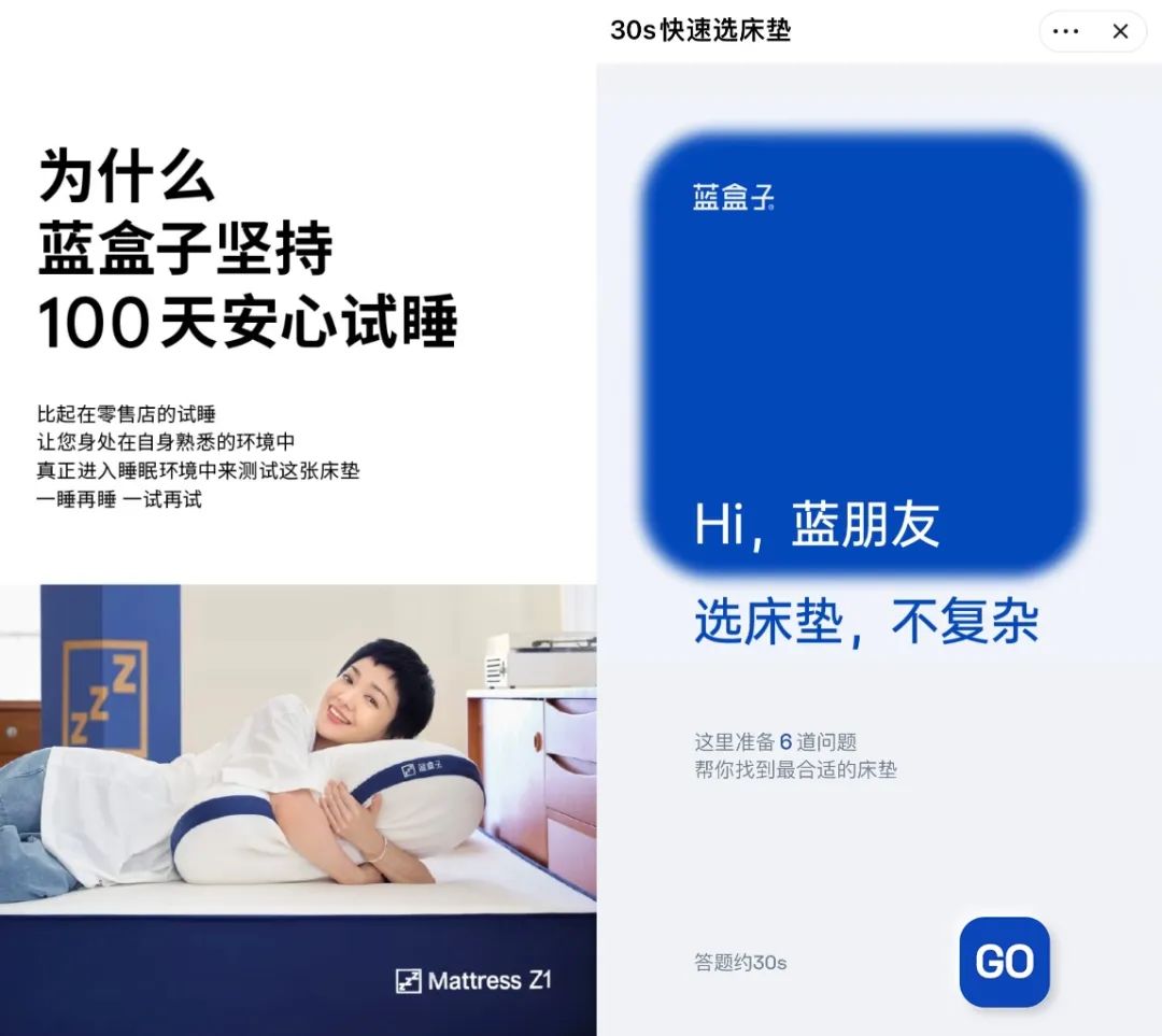 另外,蓝盒子在购买页面也设置了“30 秒快速选床垫”的专业测试,帮助顾客梳理适合他们的床垫类型。