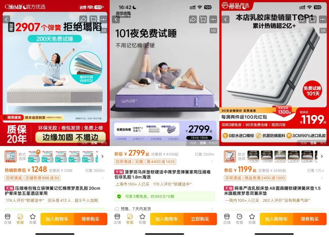 然而,在淘宝页面搜索“床垫”,不仅冒出众多与蓝盒子几近相同的产品,同时提供的试睡服务甚至比蓝盒子更久。