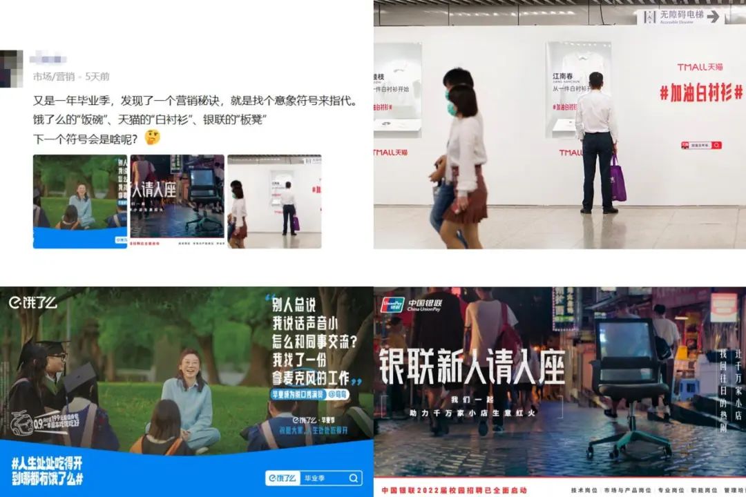 就像社交网站上引发专业思考的“符号化”广告。如通过选择与毕业季相关的具体物品——如饿了么的“饭碗”象征就业后的生活自理,天猫的“白衬衫”代表职场的正式与新开始,银联的“板凳”则可能象征耐心等待和稳定性——这些品牌成功地与消费者的实际生活和情感状态建立了联系。
