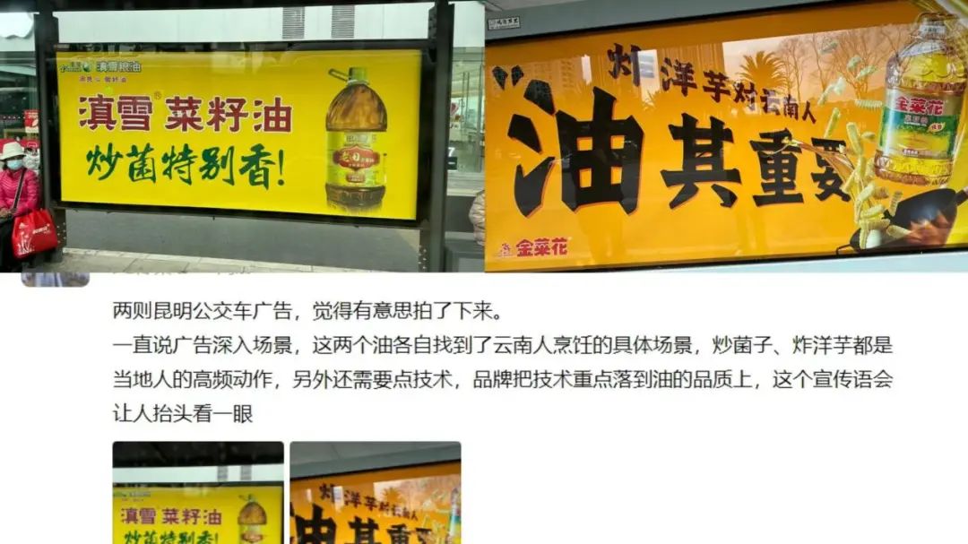 像网友发现的街头公交站普通的广告语,只要够大够深入文化场景就是最“靓”的广告。这两则昆明公交车广告如何有效地与本地文化和饮食习惯结合,进而提升了广告的针对性和吸引力。通过将广告内容聚焦于云南地区常见的烹饪行为,如炒菌子和炸洋芋,品牌成功地引起了当地居民的共鸣和兴趣。这种策略显示出广告创作者对目标市场的深刻理解,他们不仅识别了消费者的日常生活习惯,还突出了产品的实用性和专业性。