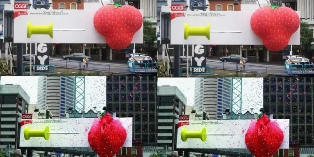 还有这则“一个大头针与逐渐长大的草莓”制造悬念和紧张的广告。极富创意的视觉表达方式来传达了其产品的新鲜“爆汁”特性,表现出色。