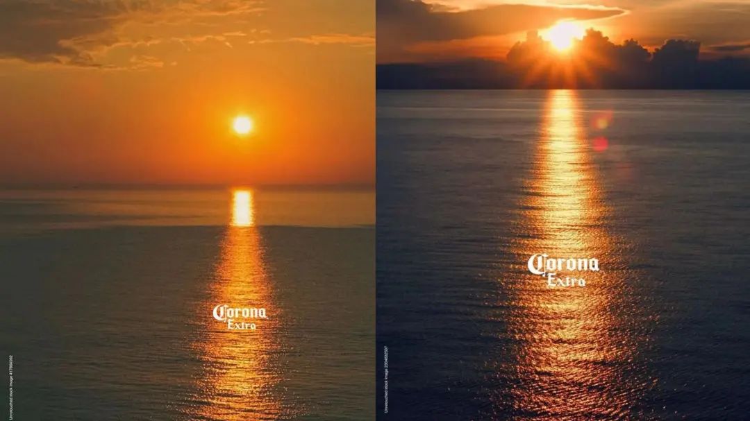 同样是环境融合类型的广告,与大自然借景的能力更上一筹。啤酒的海报广告通过巧妙地将夕阳与啤酒瓶的轮廓结合,成功地营造了一种令人难忘的视觉印象。