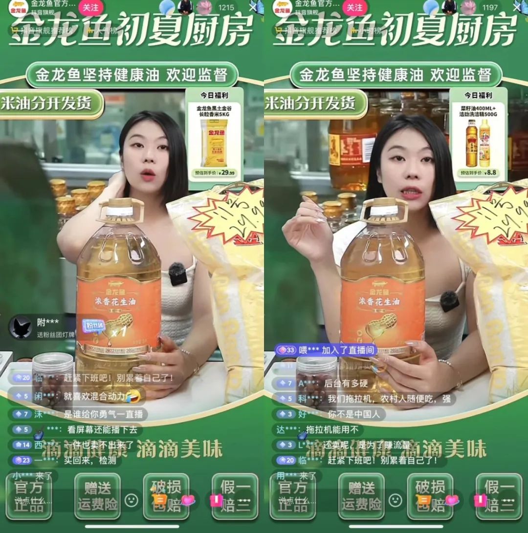 但金龙鱼直播间的背景呢,却有些针对性:不仅打出“金龙鱼坚持健康油,欢迎监督”字样,还把“灌装”视频进行循环播放。