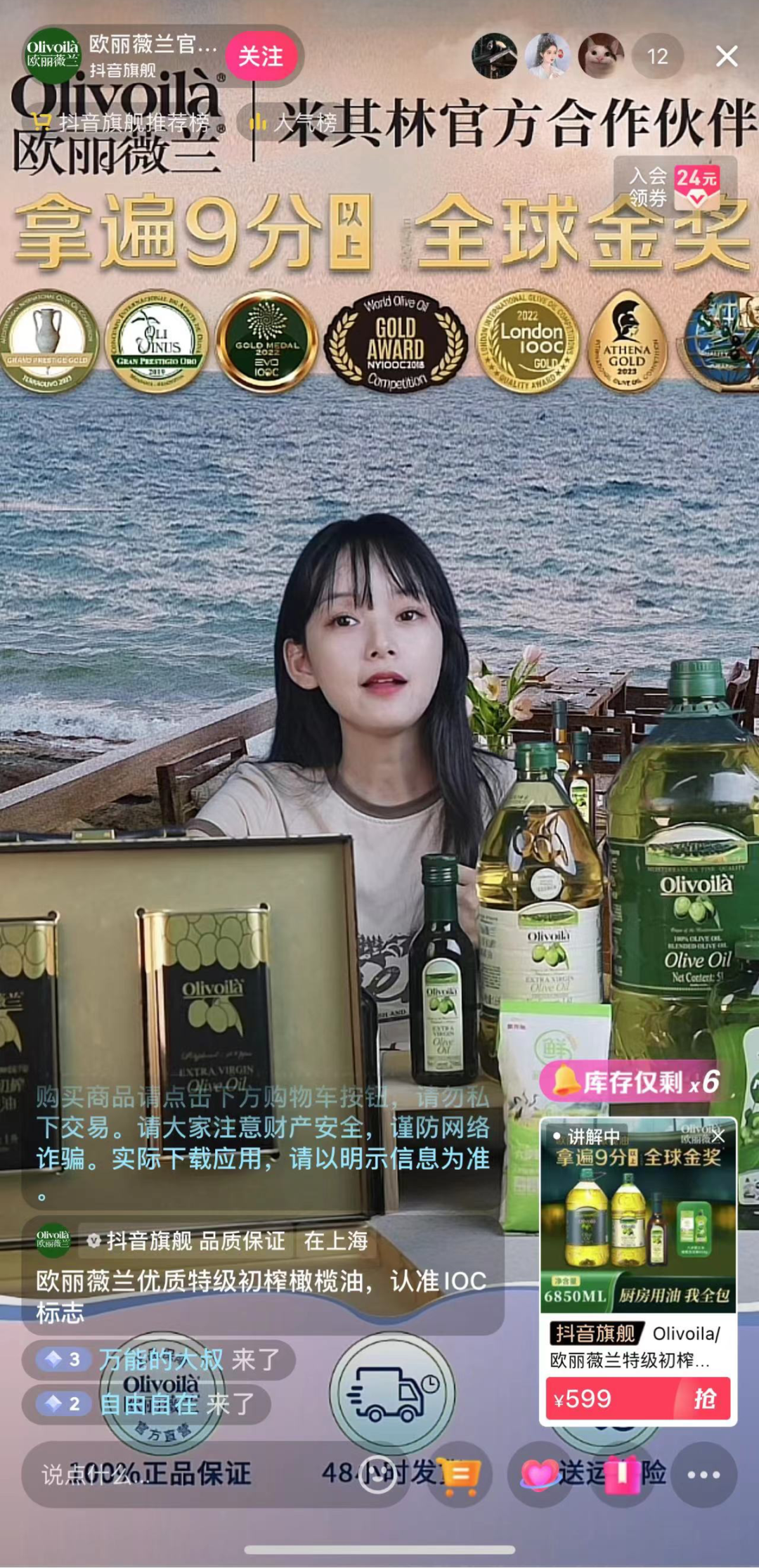 欧丽薇兰在直播间打出“米其林官方合作伙伴”、“拿边9分以上全球金奖”,强调“认准IOC标志”。