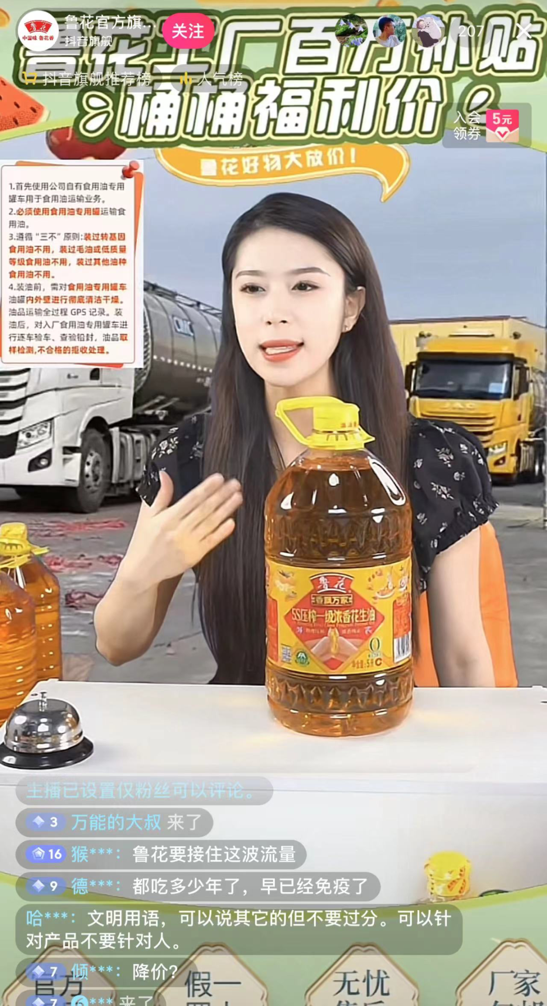在另一个名为“鲁花抖音官方直播间”,不仅有大罐车运输的短视频画面,在画面左上角,还有一个公告。强调:有专用罐车,进行彻底清洁,有GPS记录,不合格拒收。