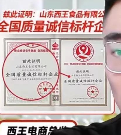 同样的,西王不仅在直播间背景视频里循环播罐装视频,还在屏幕左上角放了一个“全国质量诚信标杆企业”的证书!