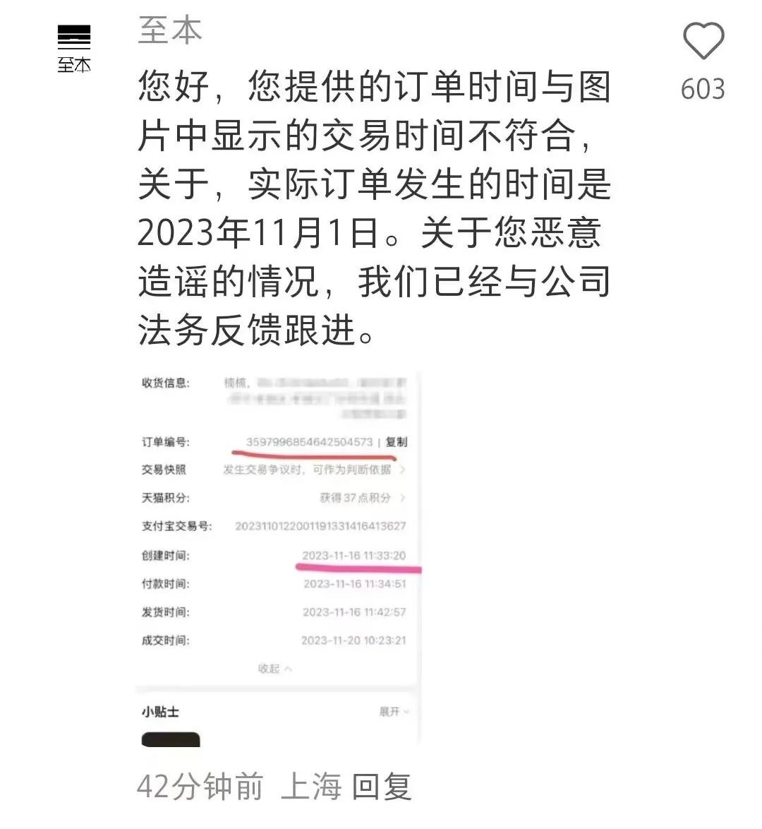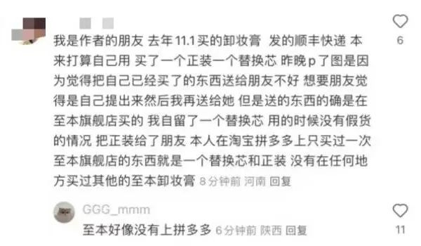 原本的帖子发生了一场唇枪舌战,事情是这样的:博主朋友拿早些时候买给自己的、非官方渠道购买的至本当做礼物送博主,博主发现是假货后索要截图,博主朋友为体面p了订单截图的时间和购买店铺。同时,网友发现拼多多并无至本官方店铺。