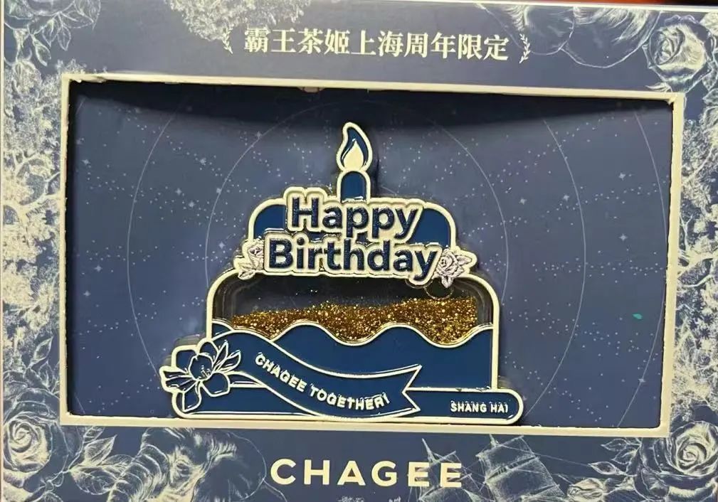 值得注意的是,不同于林里的“以丑出圈”,霸王茶姬的徽章都是实打实的颜值主义,无论是哪个款式的徽章都相当有设计感。以近期的上海一周年限定徽章为例,在生日蛋糕的形象上加入了动态流沙工艺,就足见徽章设计上的精致和用心。借用一句网上的评论,“霸王茶姬这款徽章唯一的缺点就是只有上海有”。