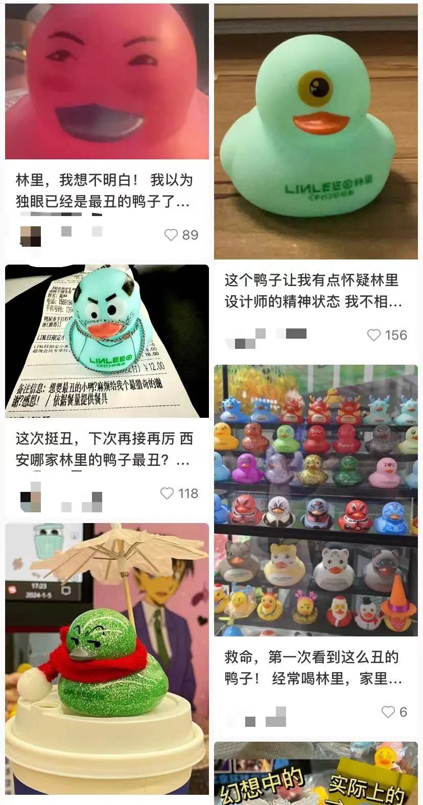 再到后来,林里的小鸭子玩偶造型干脆突破了物种限制,出现了熊猫鸭、小猫鸭、广东烤鸭等越来越奇葩的的款式。按理说,当代消费者对没有颜值的玩偶应该不会买账,然而实际上,林里的鸭子玩偶却呈现出了“越丑越有人爱”的趋势。随手在小红书上一搜,就能看到不少关于林里丑鸭子的分享和吐槽,在评论区里更是展开了最丑鸭子的大比拼。