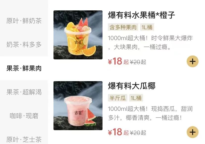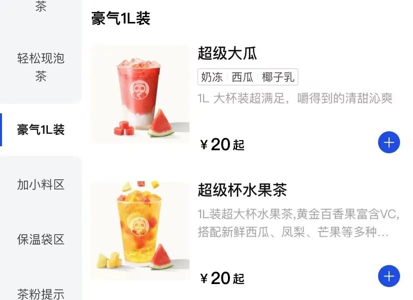 茶百道推出的豪气1L装,“超级大瓜”和“超级水果杯”,古茗1L装的“什么都有”和“水果桶,CoCo的“奶茶吨吨桶“,也是夏季热门饮品。