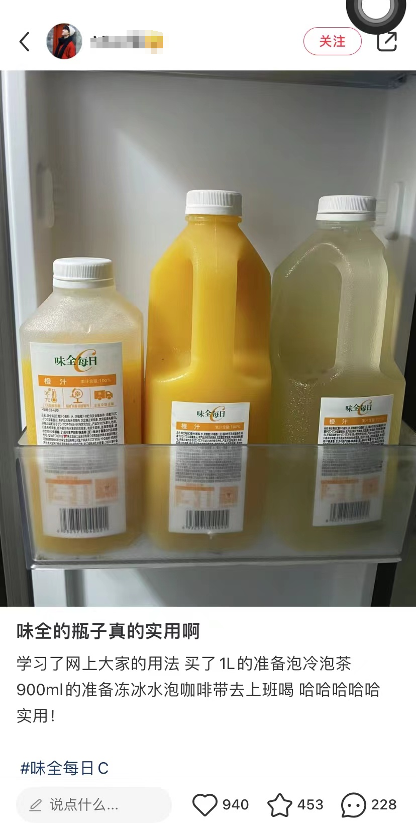 而除了大瓶饮料的容量比较有性价比,它的包装也具有性价比,很多消费者将喝完的大瓶饮料瓶进行二次利用,又能省一笔。