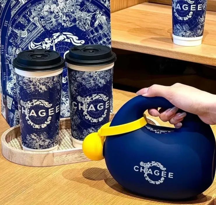 同时,霸王茶姬还推出了一款壶铃款水壶周边,蓝色的瓶身搭配黄色的盖子,黄蓝色系与霸王茶姬新品山野栀子的小蓝杯还挺般配。