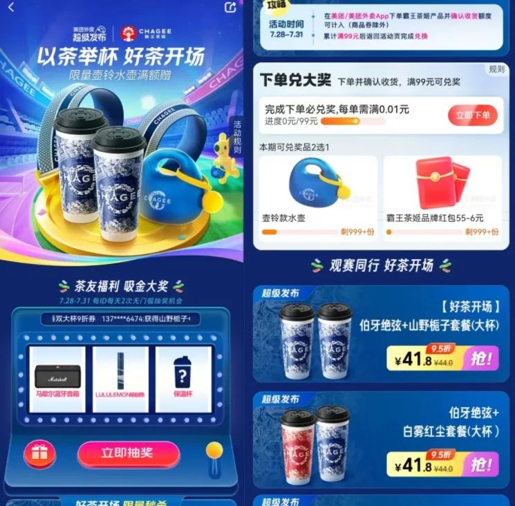 出不了国不要紧,霸王茶姬在国内也没闲着,联合美团外卖超级发布上线“观赛同行,好茶开场”活动,上新了奥运主题徽章盲盒,七枚形态各异的徽章能拼成一个奶茶杯,集满七枚就能兑换一杯奶茶。