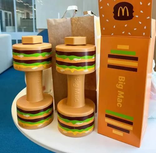 回想起麦当劳也曾推出过的一款哑铃水壶,一边吃汉堡炸鸡这些“热量炸弹”一边举哑铃,这不得瘦发财了?